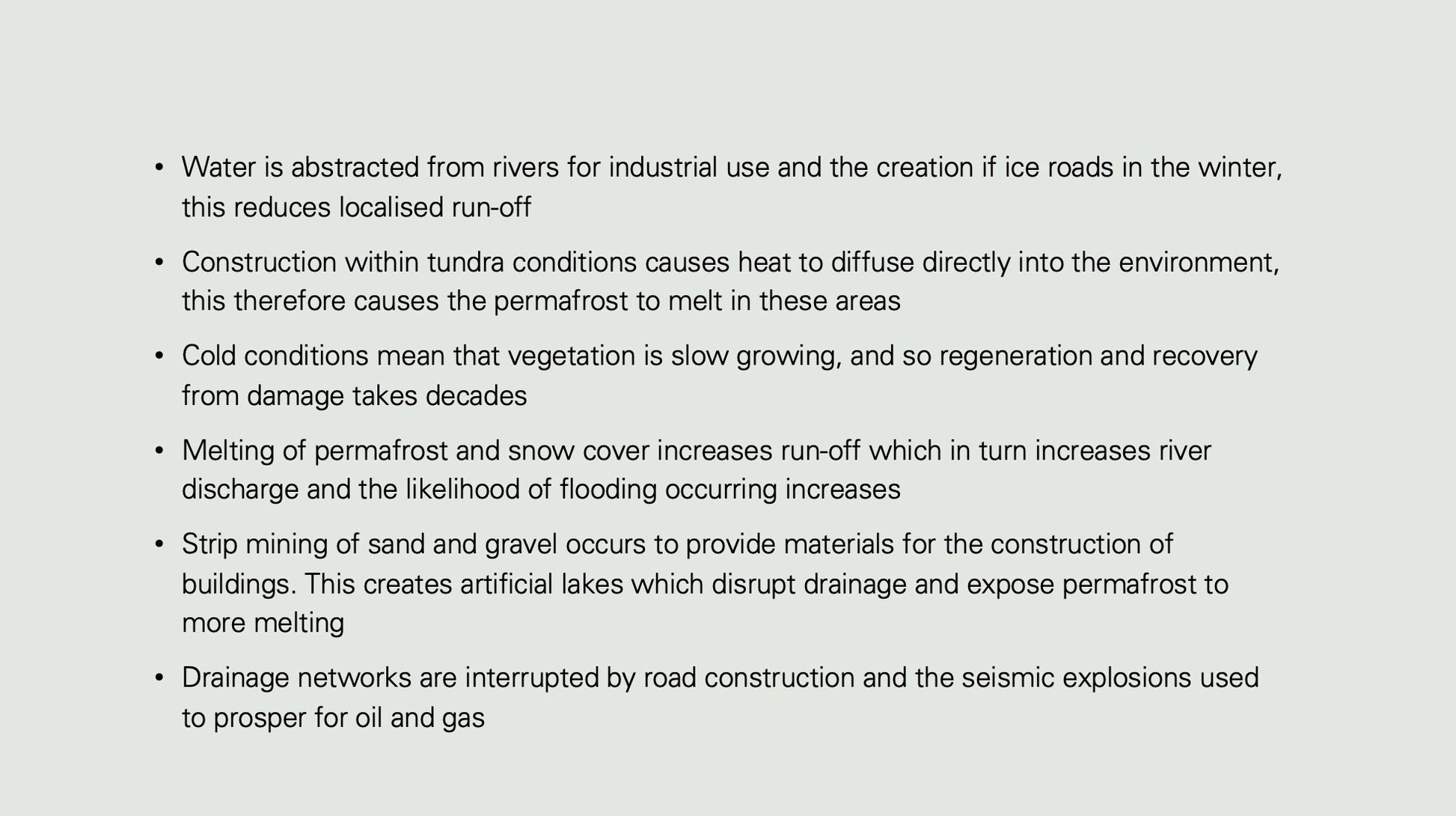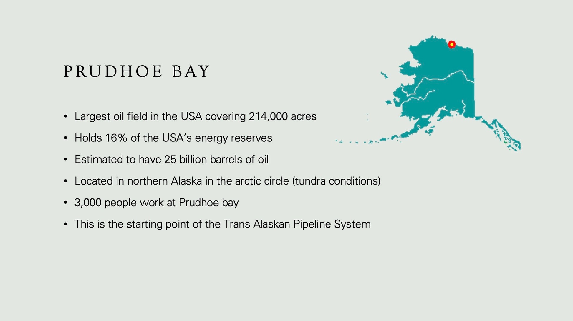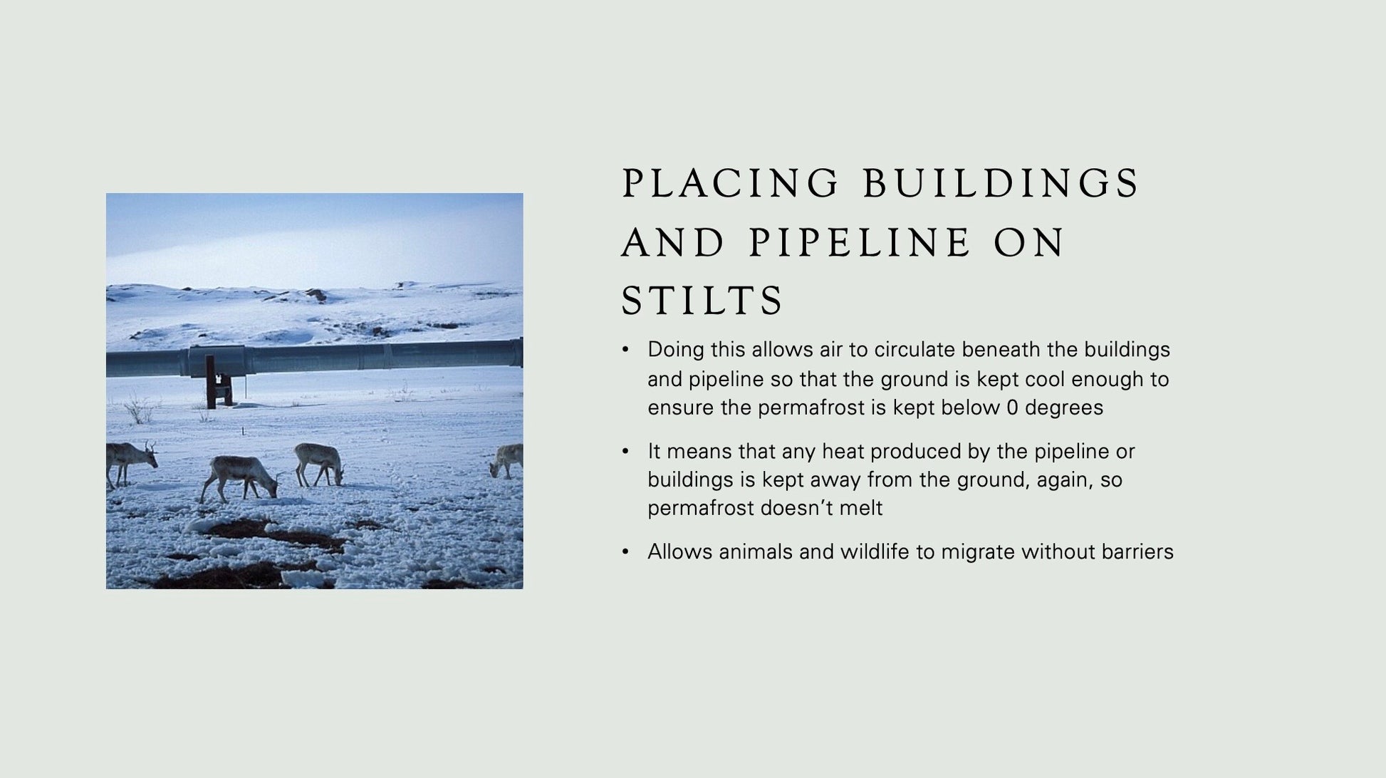 The presentation includes facts and information about the Prudhoe bay oil fields and the Trans Alaskan Pipeline System. It then goes on the talk about the impacts that oil and gas exploration has on the water and carbon cycle of the Arctic tundra with facts and figures to support this. Next there is a number of slides about the management strategies we take to reduce the impact of the oil drilling.