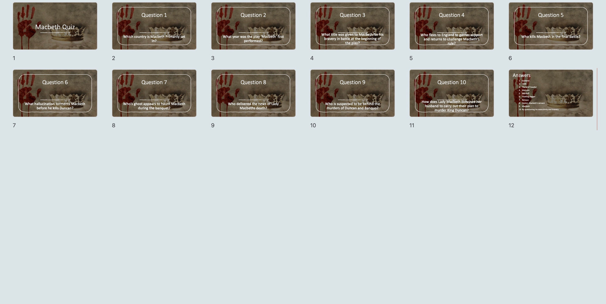 10 question Macbeth quiz with a range of questions from all of the 4 acts.